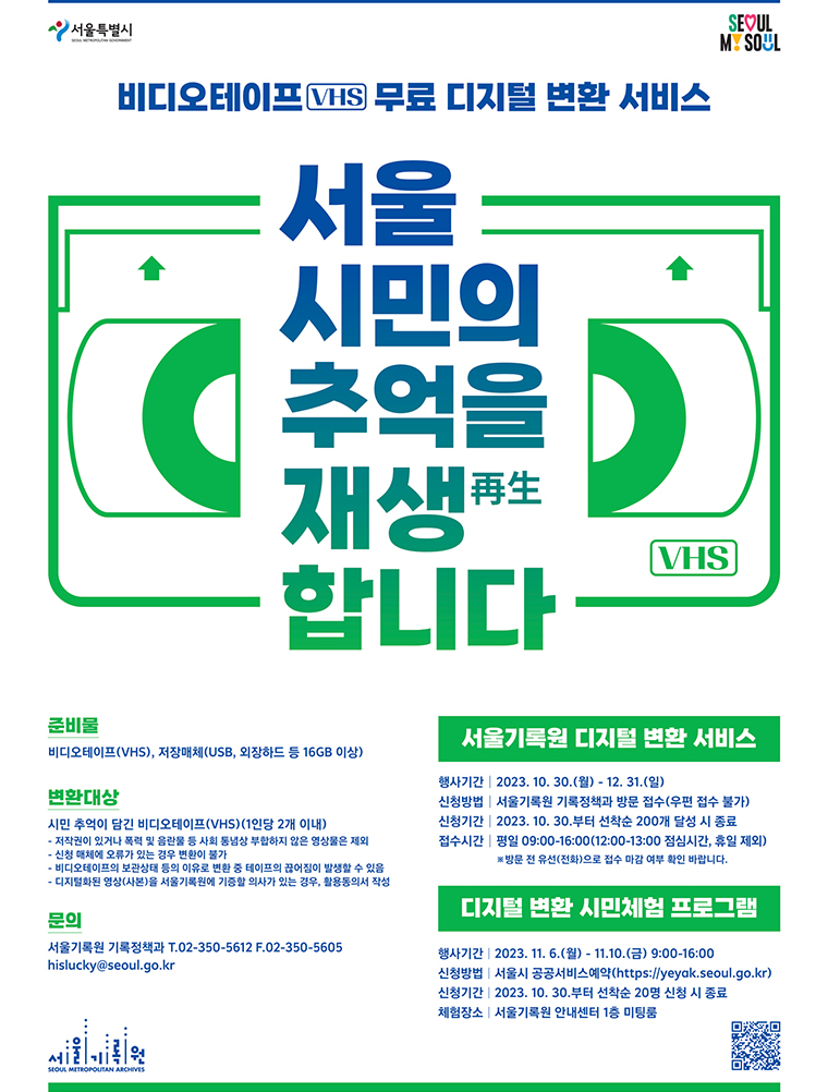 이 서비스는 오는 10월 30일부터 시작되며, 선착순으로 200개의 비디오테이프를 접수할 예정입니다. 접수는 평일 오전 9시부터 오후 4시까지 가능하며, 점심시간과 휴일은 제외됩니다. 서울기록원(서울시 은평구 통일로 62길 7)에서 직접 접수가 가능하며, USB 또는 외장하드(16GB 이상)도 필요합니다.